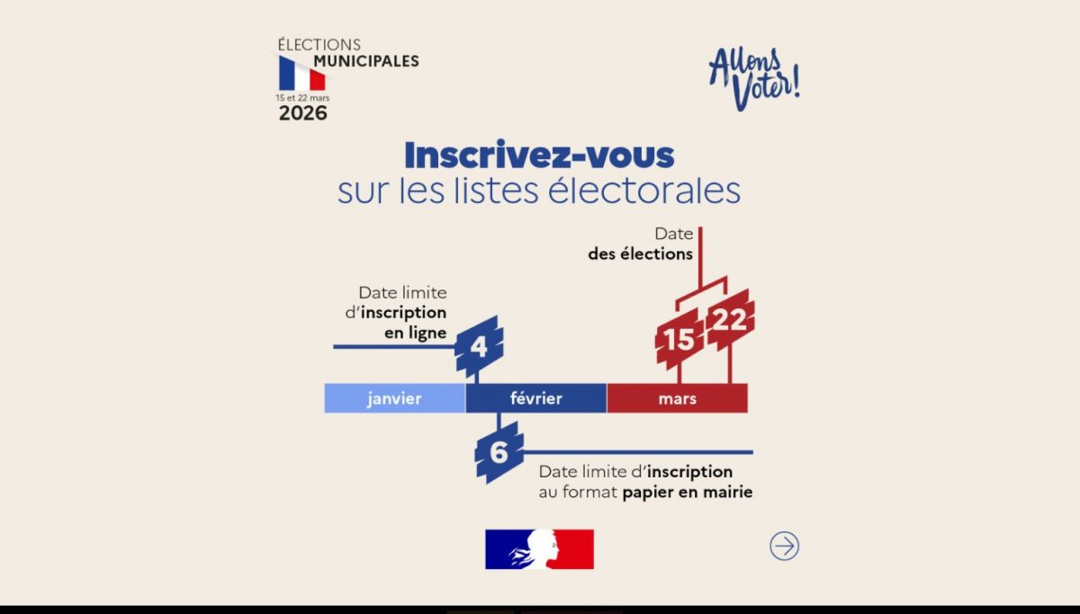 ⚠️Dates à retenir: 1er tour : dimanche 15 mars 2026 2nd tour : dimanche 22 mars 2026 La date limite d’inscription sur les listes électorales en ligne est fixée au mercredi 04 février 2026, et au vendredi 06 février 2026 pour un dépôt physique. Pensez à vérifier votre situation électorale auprès de votre mairie ou