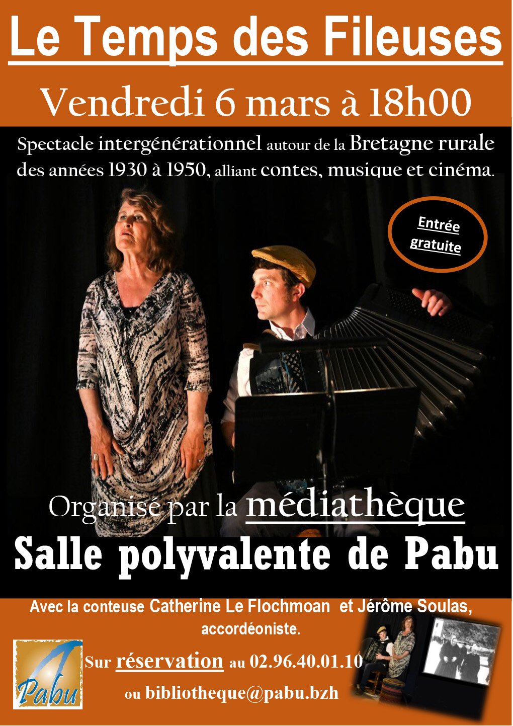 Le temps de fileuses , Balade contée musicale et cinématographique dans la Bretagne rurale des années 1930 à 1950. Catherine Le Flochmoan (chants et contes) et Jérôme Soulas (accordéon chromatique) vous y invitent avec la complicité de Christofer Bjurström (compositions) et de la Cinémathèque de Bretagne. Sur scène, trois histoires bretonnes pleines d’humour, contées par