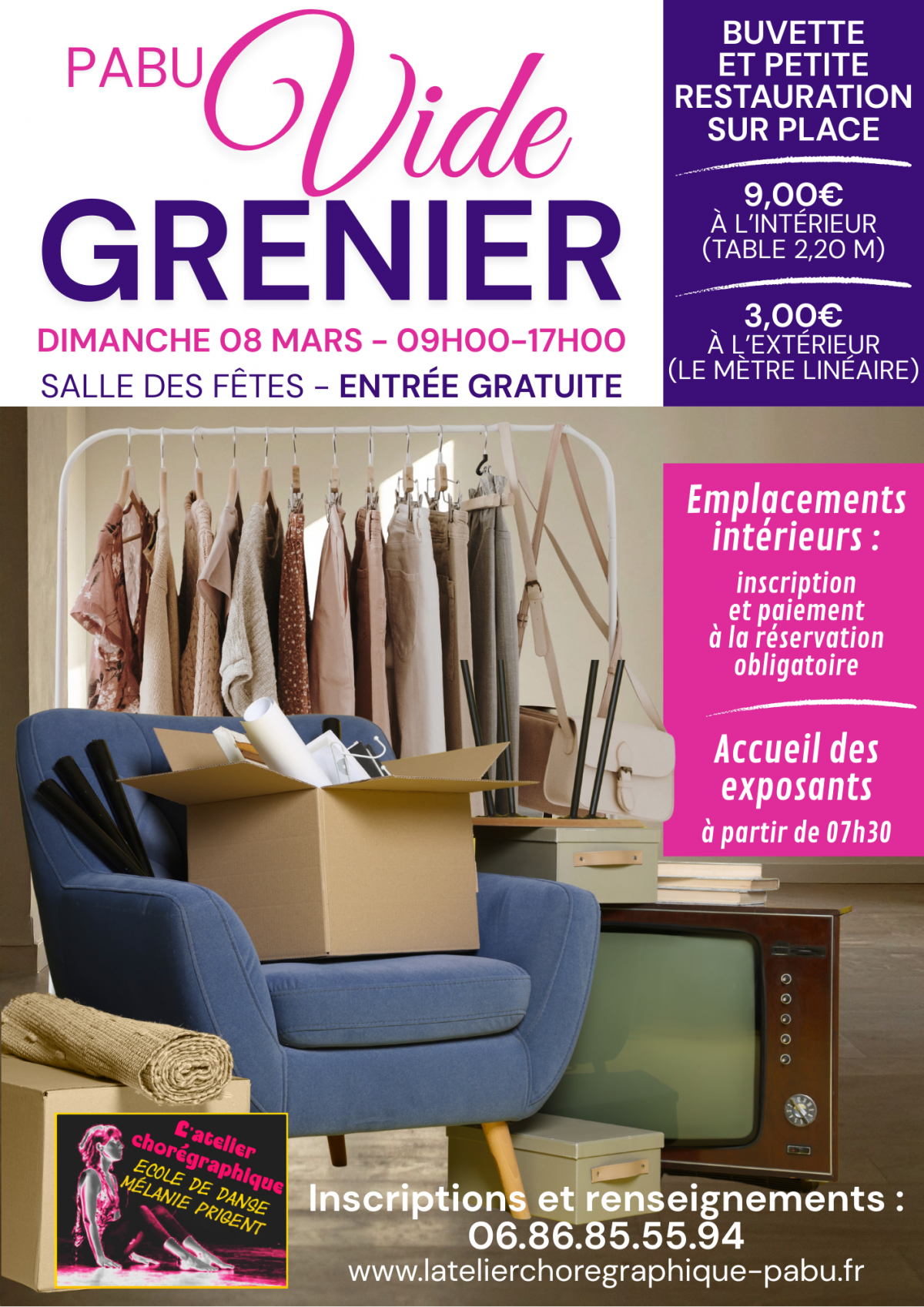L’atelier chorégraphique organise un vide grenier le dimanche 8 mars de 9h à 17h à la salle des fêtes de Pabu. Entrée gratuite pour les visiteurs Buvette et petite restauration sur place. Pour les exposants, inscriptions obligatoire au 06.86.85.55.94 ou sur le site de l’atelier chorégraphique. Accueil des exposants à partir de 7h30. Date :