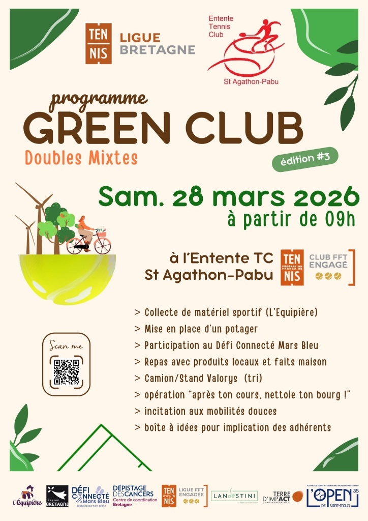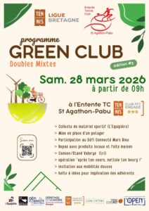 🎾GREEN CLUB – Doubles mixtes🎾 L’entente Tennis Club de Saint-Agathon a le plaisir de vous inviter à une matinée spéciale : L’opération Green Club qui se tiendra le samedi 28 Mars à partir de 10h. Exceptionnellement, toutes les séances jeunes du samedi matin seront regroupées de 10h à 13h. Au programme: =› collecte de matériel =›mise en place d’un potager