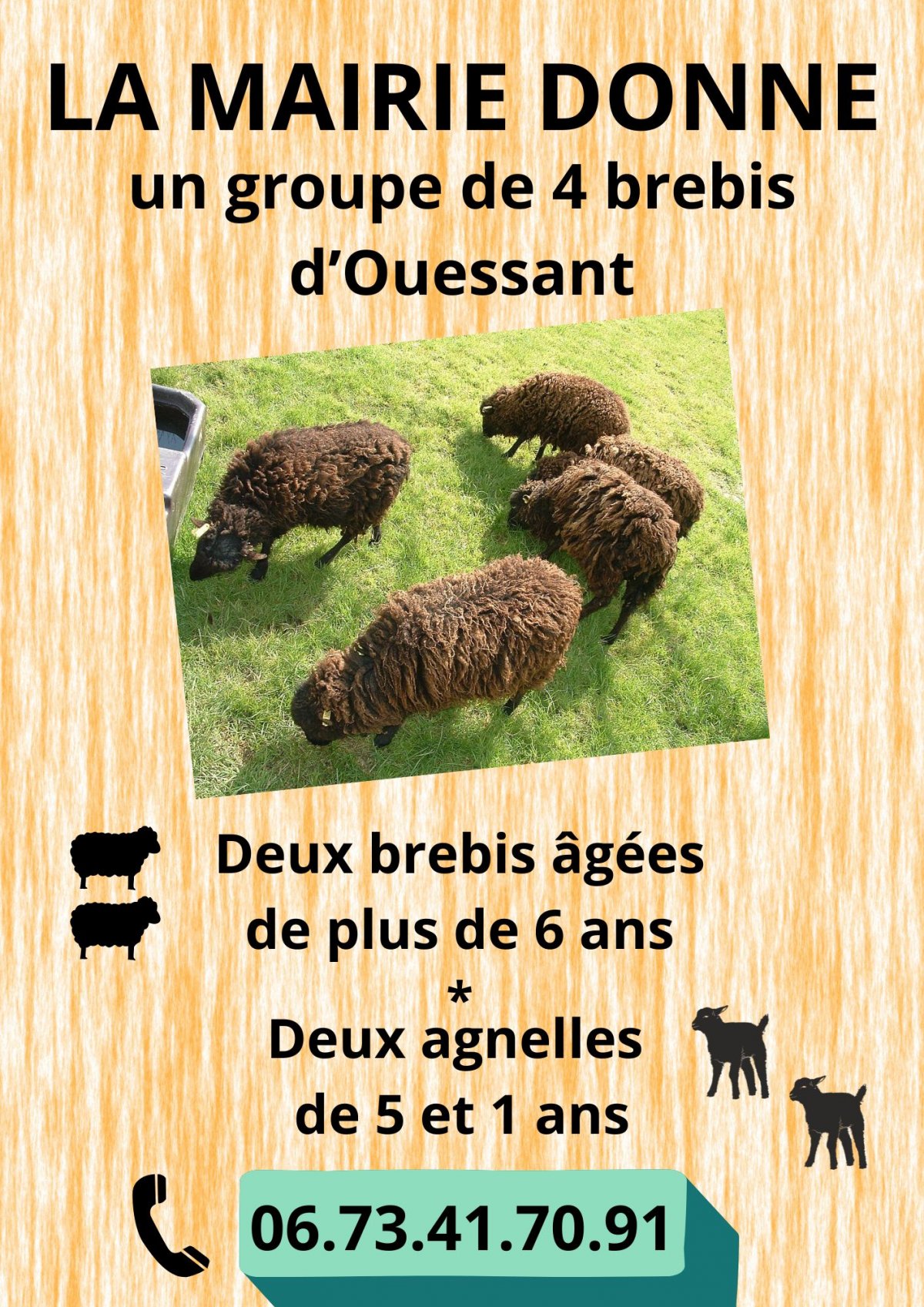 La mairie donne un groupe de 4 brebis d’Ouessant. Deux brebis nées avant 2021 , une agnelle née le 03 mai 2021 et une autre le 26 mars 2025. Pour toutes demandes d’informations complémentaires, contacter le 06.73.41.70.91 Mairie de Pabu