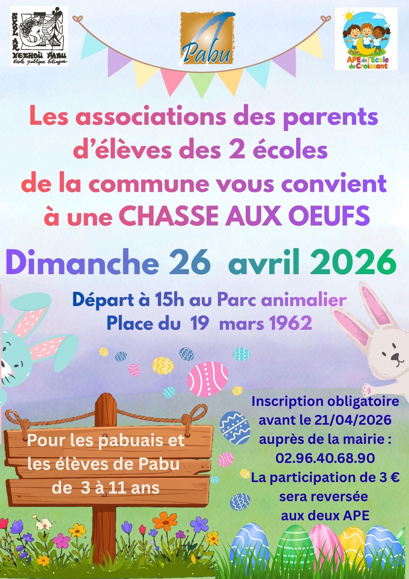 Cette année la chasse aux oeufs est organisée par les deux associations de parents d’élèves de la commune. Elle aura lieu au parc animalier, place du 19 mars 1962 – près de la la mairie – le dimanche 26 avril 2026 à 15h. La recette totale, des participations de 3 €, sera reversée en