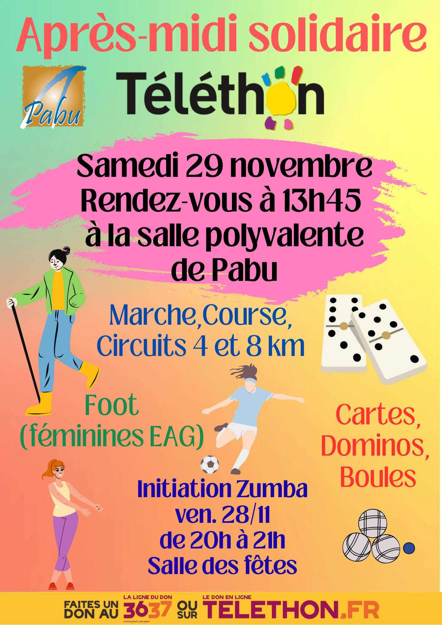 La collecte de dons en faveur du Téléthon se poursuit sur Pabu avec l’après-midi solidaire, le samedi 29 novembre à partir de 13h45. Rendez-vous à la salle des fêtes de Pabu pour une marche, des jeux de dominos, cartes ou boules et une démonstration de jonglages de l’équipe féminine de foot. Pour clore cette après-midi,