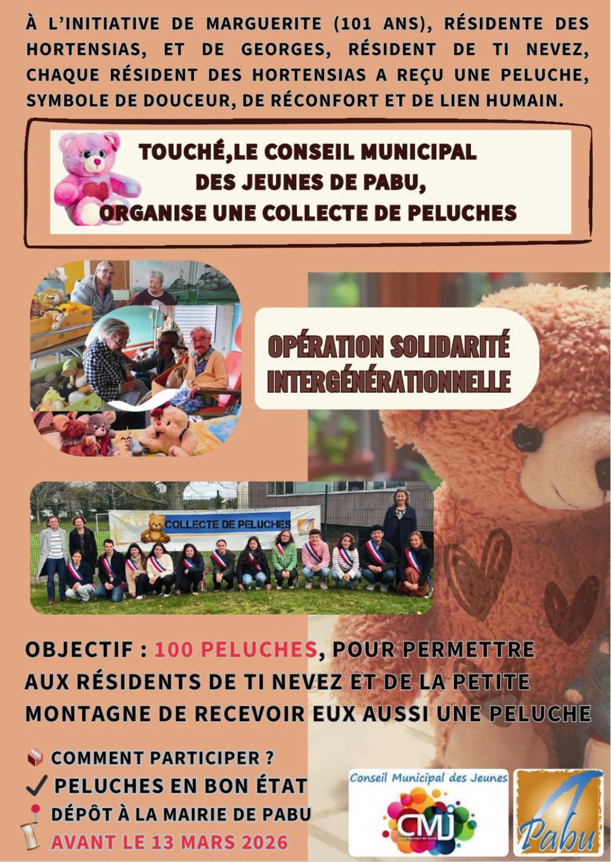 Le Conseil Municipal des Jeunes de Pabu lance une collecte de peluches dans le cadre d’une action de solidarité intergénérationnelle. À l’initiative de Marguerite (101 ans), résidente des Hortensias, et de Georges, résident de Ti Nevez, chaque résident des Hortensias a déjà reçu une peluche, symbole de douceur, de réconfort et de lien humain. L’objectif