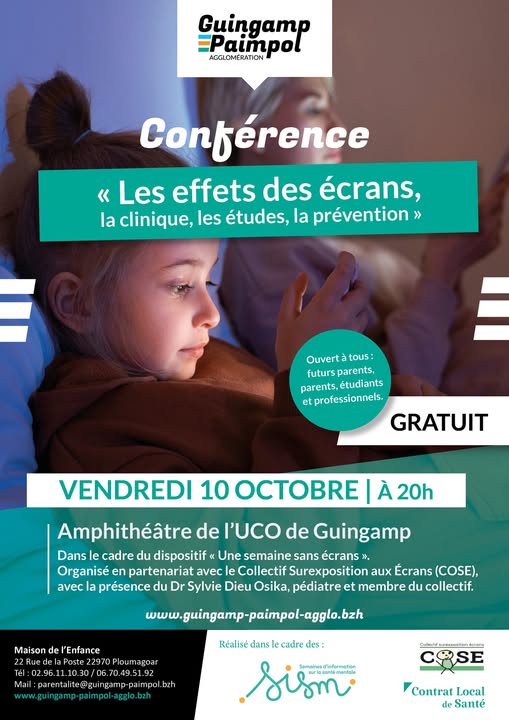 Conférence sur les effets des écrans, la clinique, les études, la prévention se tient à l‘amphithéâtre de l‘ UCO de Guingamp demain soir, vendredi 10 octobre à 2025 à 20h. Dans le cadre du dispositif « Une semaine sans écrans« , la maison de l‘enfance organise en partenariat avec le Collectif Surexposition aux Ecrans (COSE)