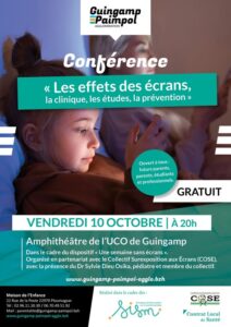 Conférence sur les effets des écrans, la clinique, les études, la prévention se tient à l‘amphithéâtre de l‘ UCO de Guingamp demain soir,