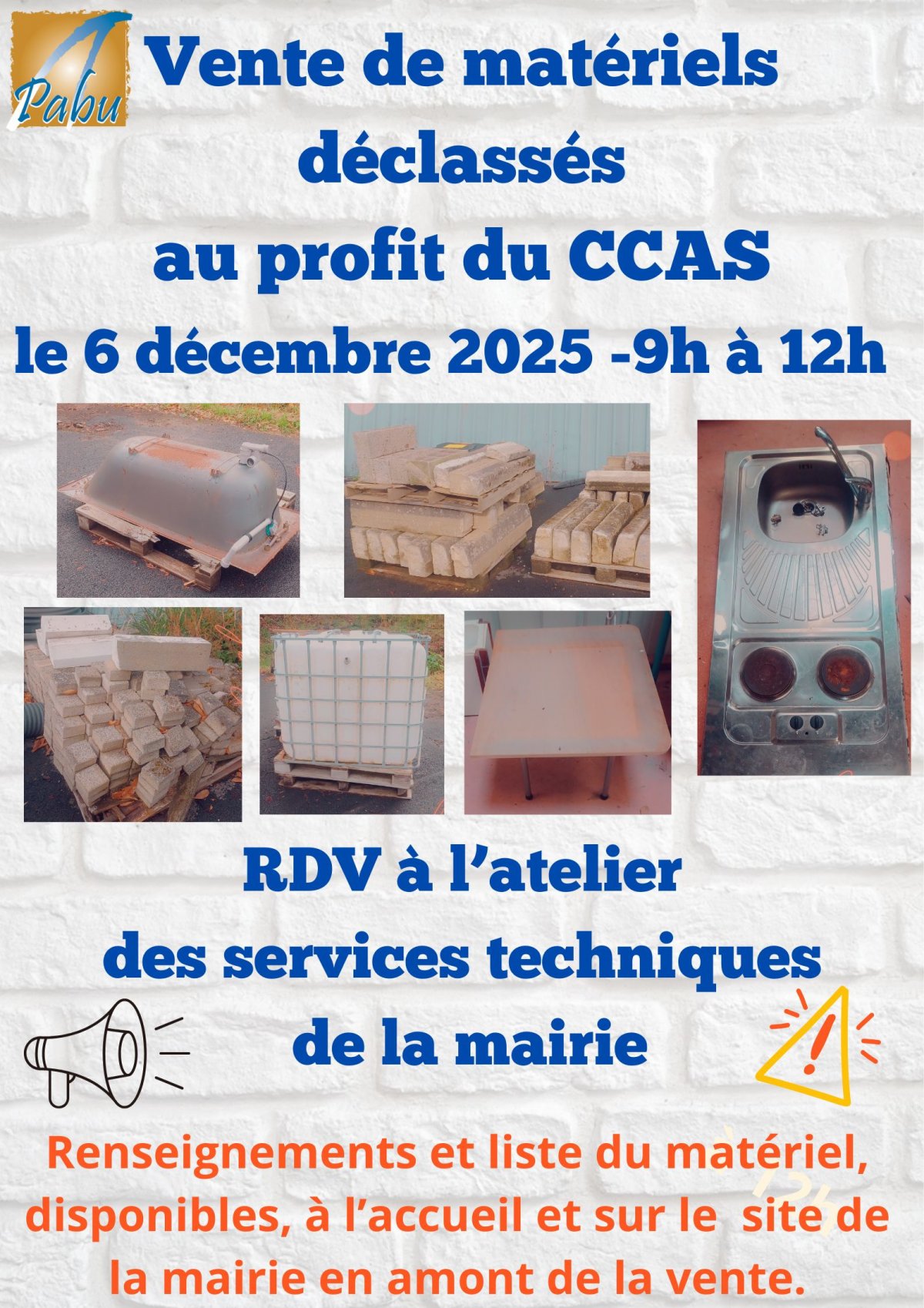 Suite à la première vente déclassées qui a eu lieu le 25 septembre, des biens restent disponibles à la vente au profit du CCAS. Une nouvelle vente aura lieu ce samedi 6 décembre de 9h à 12h. Renseignements et liste du matériel disponible en mairie en amont de la vente.